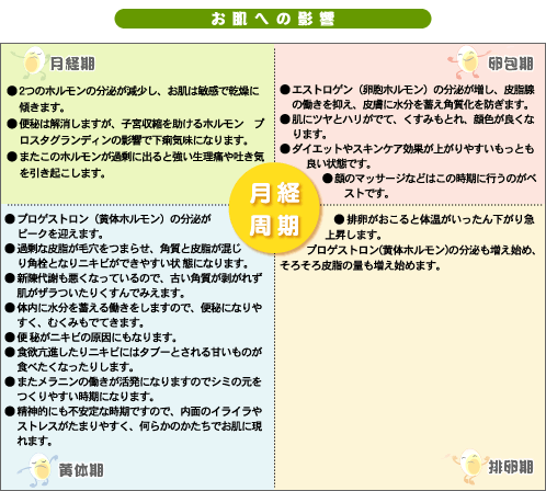 女性は毎月の月経周期に合わせて女性ホルモンが分泌され、これによって、お肌の状態も大きく 影響を受けます。女性ホルモンには大きく分けてエストロゲン(卵胞ホルモン)とプロゲストロン(黄体ホルモン)の2種類があります。